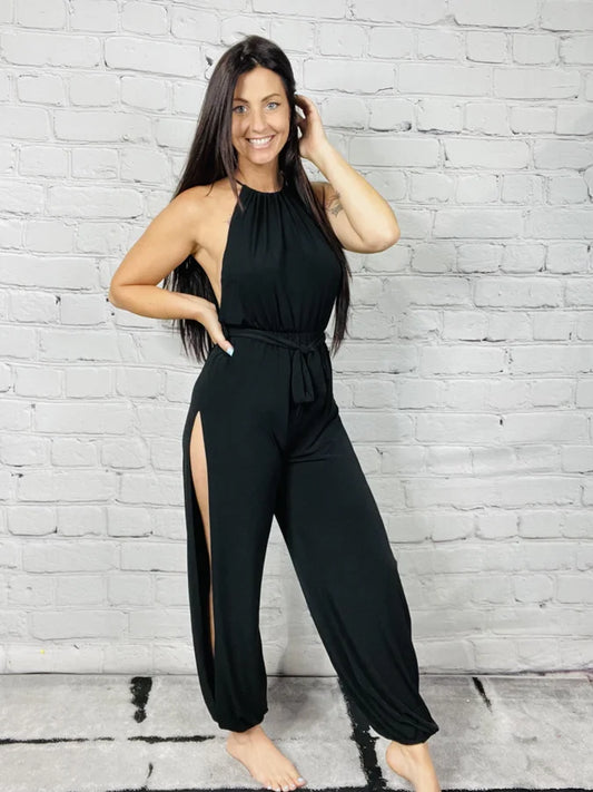 "Show Stopper" Black Halter Neck Split Side Jumpsuit