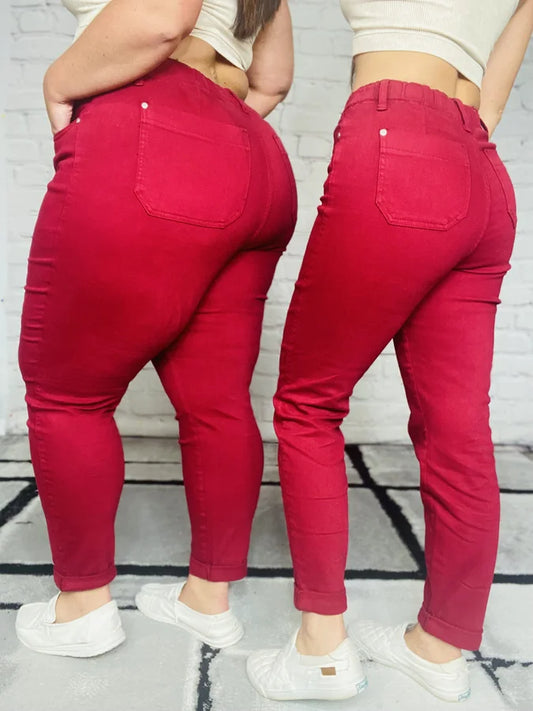 Judy Blue - "Mackenzie" Scarlet High-Waisted Double Cuff Denim Joggers