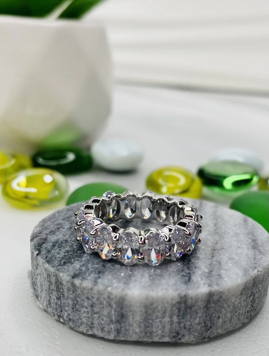 Rhodium Plated Oval Cubic Zirconia Eternity Band