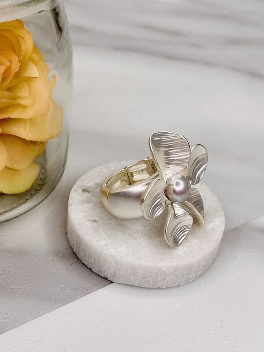 Pearl Silver Flower Elastic Ring by Periwinkle