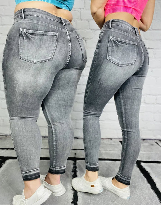 Judy Blue - "Angela" Grey High-Waisted Tummy Control Release Hem Skinny Jeans