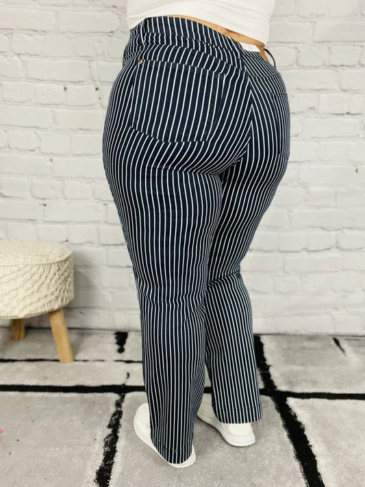 Judy Blue - "Regina" Dark Blue High-Waisted Striped Tummy Control Straight Leg Jeans